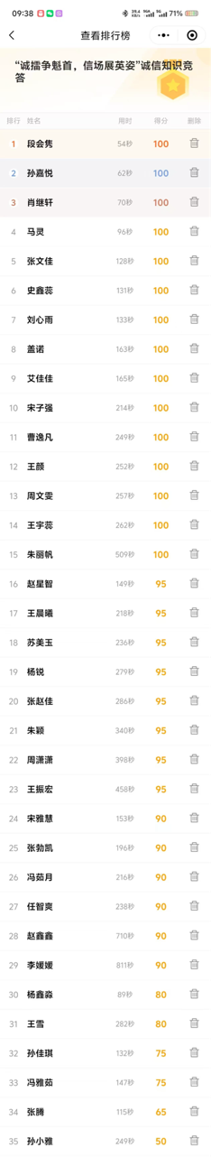 活动期间,同学们积极参与。在“诚擂争魁首,信场展英姿”诚信知识竞答中,诸多同学表现优异,不少同学取得了满分佳绩,充分展现出了对诚信知识的扎实掌握;其余同学也全力以赴,各有所获。大家积极参与的态度不仅为活动增添了光彩,更有力地推动了诚信校园氛围的营造。