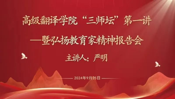 最后,严明教授就如何“弘扬教育家精神”分享了自己的心路历程。指出成为一名党和人民满意的好教师就要具有“四有好老师”、“四个引路人”和“四个相统一”标准。作为新时代高翻人,要主动适应国家发展重大战略、行业发展及产业科技变革、当前及未来翻译与国际传播人才培养需求,勇担国家翻译能力建设新使命,讲好中国故事,传播好中国声音,为国家的改革开放和我国国际传播事业发展输送更多更好的高层次、应用型、专业化翻译人才。
