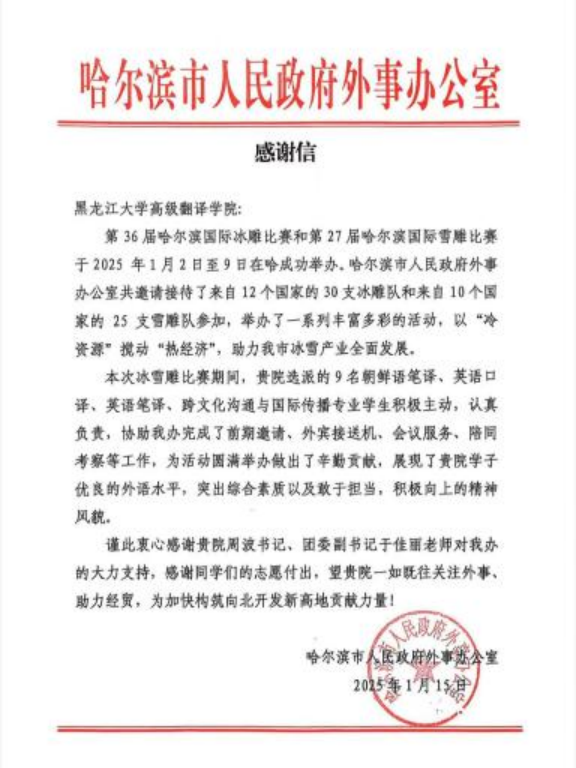鉴于翻译志愿者们为活动圆满举办做出的辛勤贡献及展现的优良风貌,哈尔滨市人民政府外事办公室特向公司发出感谢信。期待学子们以更加昂扬的姿态投身于各项翻译活动当中,展现志愿风采,书写黑大担当。