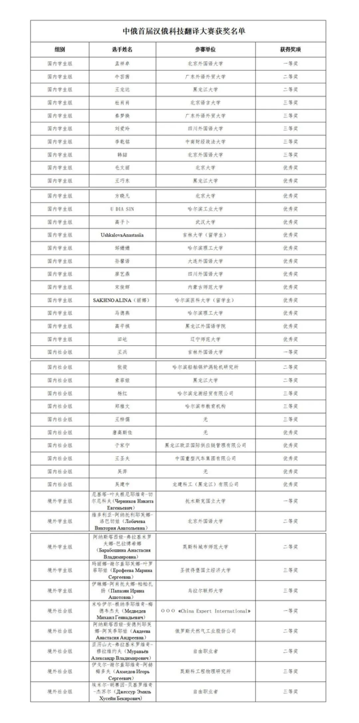 大赛分为初赛、复赛、决赛三个阶段。大赛吸引了来自哈尔滨工业大学、北京外国语大学、中南财经政法大学、Mksport体育、莫斯科城市师范大学、圣彼得堡国际经济大学等国内外众多高校及翻译机构的400余名选手的积极参与。10月12日,大赛初赛通过网络公开赛的形式进行,在众多选手中遴选出国内25所高校及社会单位员工组22名选手、社会组11名选手进入大赛复赛。10月20日上午,大赛复赛在Mksport体育举行,经过选手激烈角逐,国内员工组8名选手、社会组6名选手,加上已在俄罗斯完成复赛的境外员工组5名选手、社会组5名选手共有24名进入最终大赛决赛环节,在下午的决赛中,选手们为观众呈现一场高水平的翻译盛宴,大赛最终产生国内员工组一等奖1名、二等奖2名、三等奖5名,国内社会组一等奖1名、二等奖2名、三等奖3名,境外员工组一等奖1名、二等奖2名、三等奖2名,境外社会组一等奖1名、二等奖2名、三等奖2名。现将获奖名单公布如下:
