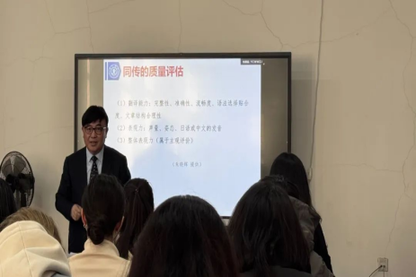 此外,李教授还与师生探讨了同声传译的难点和技巧,提出视译在同声传译训练中的重要性。强调同声传译不仅要求译者有较高的日语水平,对母语的理解也至关重要。能否准确理解母语,是确保翻译准确性的基础。讲授了同声传译需要掌握六个要素:主要信息的完整性、准确性;表达的流畅性和自然性;声音的稳定性、音量适中、语速的适度;语音语调的标准性;语气、语调与发言者的协调性;以及节奏感的掌握。李教授特别指出,只有真正理解同声传译的六个要素,精准掌握口译技巧,并逐一克服难点,才能成为一名合格的译员。
