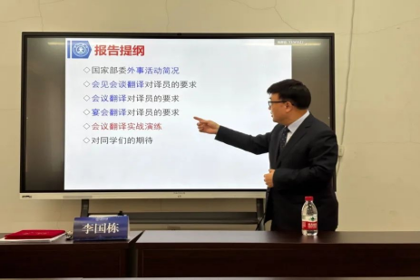 李国栋教授首先分享了自己从事外事翻译的经历和经验,强调做口译工作应胆大心细。即不要怕犯错、大胆翻译,但速记时需准确记录数字、人名和地名等。此外,李教授还介绍了国家部委外事工作的简况,外事人员的工作内容、会谈会见翻译、会议翻译和宴会翻译等。李教授根据不同场合的翻译特点,分别指出了其具体的工作内容和注意事项。如在会见会谈翻译中,译员需了解会议主题,撰写会议纪要,跟踪工作进展以及协调推进落实;在会议翻译中,译员需撰写领导讲话稿、会前与外方沟通协调,在承担交传任务时应确保语言的得体以及仪态的端庄大气;在宴会翻译中,译员需注意政治敏感话题,不可随意表态。